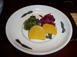 Las comidas tienen lugar en las estancias privadas de cada habitación y se come sentado en cojines que por la noche han de dejar sitio al futón. Las comidas suelen consistir en cocina tradicional japonesa conocida como kaiseki, que incluye especialidades regionales y de temporada. Kaiseki originalmente se refería a comidas ligeras servidas durante la ceremonia del té, y hoy se refiere a una comida que consta de varios platos pequeños y variados. Algunos ryokan también sirven especialidades locales como basashi o comida cocinada en un hogar irori.[cita requerida]