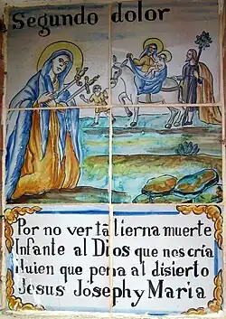 - El segundo dolor detalla la huida a Egipto (Cf. Mateo 2, 13-15). El motivo pictórico representa aquella evasión, para evitar la matanza de Jesús a manos de los esbirros de Herodes. La Virgen aparece con dos espadas clavas en el pecho, mientras que en la otra escena se representa a María con el Niño en brazos (ambos con aureola), a lomos de un borriquillo, de cuya rienda tira un infante. Detrás camina san José, portando un bastón florido. En el recuadro de la cenefa se lee: Por no ver tan tierna muerte/ Infante al Dios que nos cría/ Huien que pena al disierto/ Jesús Joseph y María.[1]