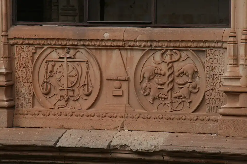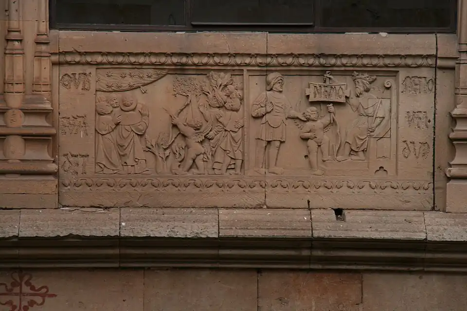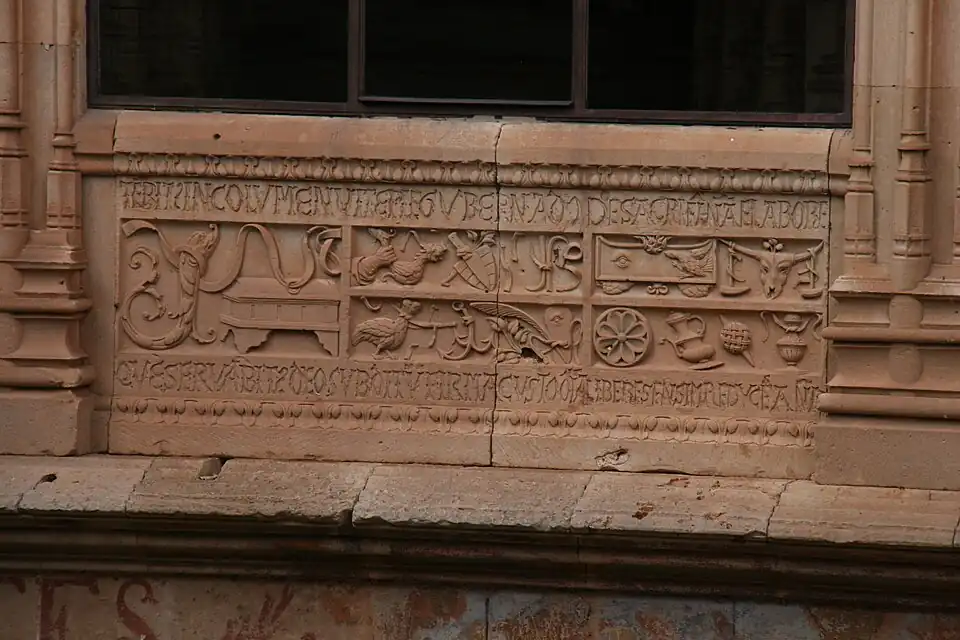 El edificio de la Universidad posee diversas obras alegóricas en la fachada exterior, concretamente en su Fachada Rica, siendo la rana sobre la calavera una de sus expresiones más populares y visitadas de la ciudad. En el interior del edificio de la Universidad los relieves (externos e internos) de la escalera que permite subir a la segunda planta del patio resultan ser un ejemplo de decoración alegórica que hace mención a las virtudes de ambos sexos, así como una descripción de las actitudes deseables en el matrimonio por parte de cada cónyuge.[4][5] En el antepecho del claustro, en el lateral que va a dar a la biblioteca, aparecen debajo de cada ventana unos bajorrelieves, en total siete, consistentes en una distribución de pequeñas figuras dispersas y acompañadas cada una de ellas de unas inscripciones en latín. Las letras son apenas legibles por haber desaparecido con el tiempo los rellenos de metal que antes las rellenaban. Cada ventana del antepecho del patio superior posee relieves, en su interior y en su exterior. Los denominados emblemas, o enigmas, se encuentran en el exterior.