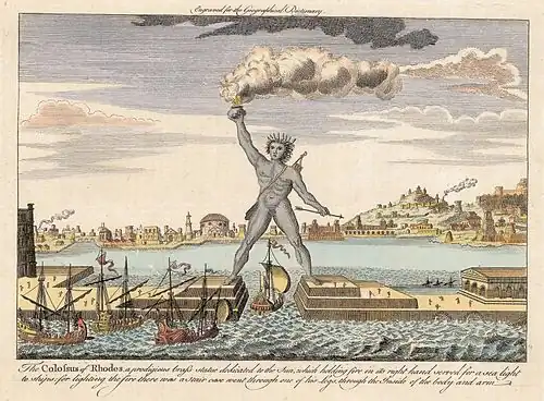 La maravilla más desconocida de todas es el Coloso de Rodas. Se poseen descripciones de la estatua y de su tamaño en comparación con los seres humanos, pero no han llegado representaciones del mismo ni de su emplazamiento.[17] No se sabe con certeza si los rodios reconvirtieron la máquina de asedio Helépolis en una estatua, como indica Filón de Bizancio, o vendieron las piezas que no se pudieron utilizar y con lo cobrado financiaron la construcción del monumento, según Fernando Quesada Sanz (2009, p. 225). Tampoco se conoce su emplazamiento, pese a poder descartarse la bocana del puerto, se piensa más bien en algún lugar alto de Rodas, pero se sabe que sus restos fueron vendidos como chatarra décadas después de caer «sobre las casas» y no en la bocana del puerto. Por este motivo su reconstrucción ha cambiado mucho con los siglos, lo mismo que la ubicación exacta.[5]
