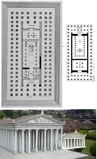 - El templo de Artemisa, por su parte, poseía dos columnatas en estilo jónico sobre las que descansaba la techumbre, en lugar de los dos cuerpos con los que fue pintado.[2]