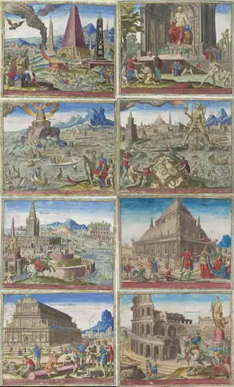 Las siete maravillas del mundo antiguo fueron un conjunto de obras arquitectónicas y escultóricas que los autores griegos, especialmente los del período helenístico, consideraban dignas de ser visitadas. A lo largo del tiempo se confeccionaron diferentes listados, pero el definitivo no se fijó hasta que el pintor neerlandés Maerten van Heemskrerck realizó en el siglo XVI siete cuadros representando a las siete maravillas, las cuales eran: la Gran Pirámide de Guiza, los Jardines Colgantes de Babilonia, el Templo de Artemisa en Éfeso, la Estatua de Zeus en Olimpia, el Mausoleo de Halicarnaso, el Coloso de Rodas y el Faro de Alejandría.