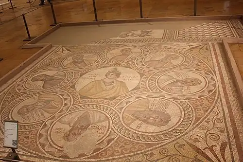 Calíope, en medio de Sócrates y los Siete Sabios (Baalbeck, siglo III d. C.), expuesto en el Museo Nacional de Beirut.
