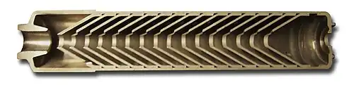 A este se le practican diversas perforaciones a lo largo del mismo (dependiendo del diseñador varían en número, ángulo, diámetro y espaciamiento) lo que ayuda a la reducción de la velocidad de la bala y promueve el escape de gases hacia las cámaras de expansión del silenciador el cual cubre esta parte del cañón.