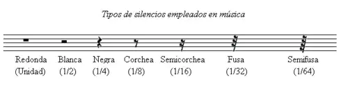 Cada figura musical cuenta con su correspondiente silencio que representa su mismo valor o duración. Se considera que el silencio es una nota que no se ejecuta. La combinación de silencios utilizados para marcar las pausas sigue las mismas reglas que para las figuras musicales.[4]​ Para ampliar información véase figura musical.