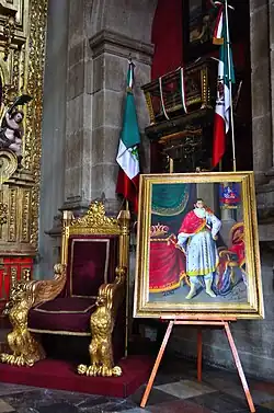 Luego de la conquista y construido el Palacio Virreinal, en lo que hoy es el Salón de Recepciones se construyó un trono con dos sillas especialmente adornadas para el monarca español y su esposa, ambas bajo un palio y un manto que cambiaba con el escudo de cada uno de los reyes españoles, de ese trono se tienen pocos registros, nunca fue usado, estaba preparado para recibir a algún monarca español que visitara la Ciudad de México; cuando el Virrey hacía actos oficiales en ese salón, usaba una silla cualquiera situada debajo y a la derecha de la plataforma donde se ubicaban las sillas del trono, como un distintivo de su supremacía política, pero nunca se menciona que fuera una silla especial, al contrario de lo que pasaba con el monarca y su consorte.[5]