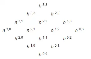 Las dimensiones hp,q de los espacios armónicos(p,q)-en su forma diferencial armónica se disponen convencionalmente en la forma llamada Diamante de Hodge. Para un campo de tres dimensiones, por ejemplo, el diamante de Hodge p y q que va de 0 a 3: