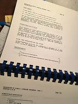 Partes de las páginas 158 y 159 del DECsystem-10 SIMULA Language Handbook, Part I, publicado por el Swedish National Defense Research Institute. Este manual se utilizó en 1980.