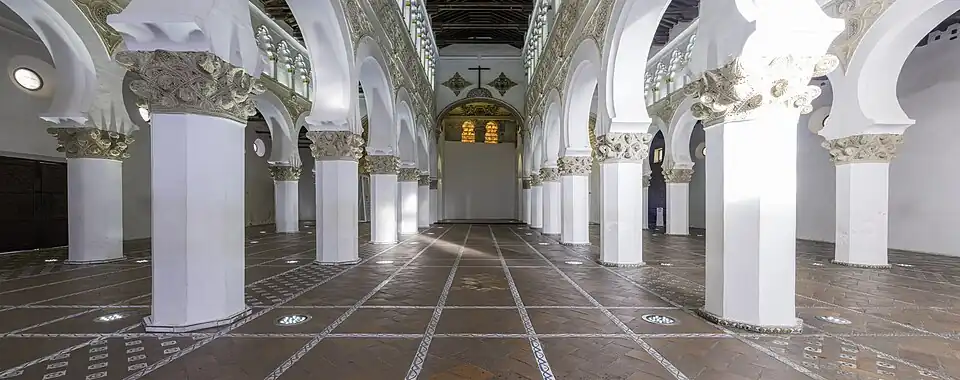 Los 32 pilares de este templo son de ladrillo recubierto por cemento y cal. Ornados de piñas y volutas, sus capiteles denotan influencia del arte románico. Por encima de los arcos de herradura prevalece la ornamentación abstracta en frisos horizontales que incluye molduras con delicados motivos basados en la interacción de líneas y medallones. Los entrelazados geométricos formados por las líneas son de origen almohade.