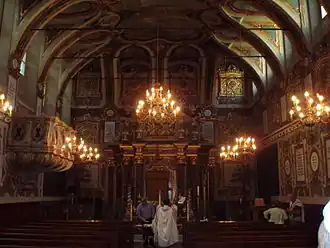 En contraste con el exterior sin adornos, el interior de la sinagoga está ricamente decorado con pinturas y estucos dorados, conservando el mobiliario barroco original.