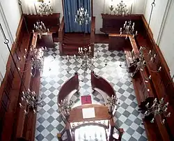 El acceso a la sinagoga es a través de un amplio pórtico arqueado que conduce a un pequeño patio abierto. Una placa en su interior atribuye la fundación a Jeudà, hijo de Shebbetai. En la puerta de entrada hay una inscripción que dice: