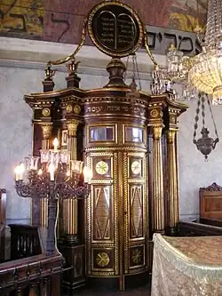 El aron y la bimah, de madera dorada, son del siglo XVIII y proceden de la primera sinagoga. En cambio, los bancos de madera oscura pertenecen a la reconstrucción del siglo XIX. Del techo cuelgan candelabros de madera dorada y cristal. La sala podía acoger a más de trescientas personas.