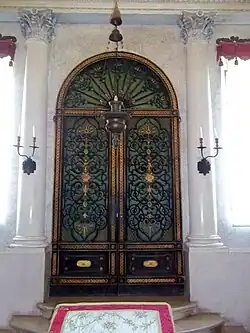La sala contiene una serie de bancos de madera frente al arón ha-kódes (Armario sagrado), ubicados en el nicho, a los que se accede subiendo tres escalones, colocados en el centro del muro frente a la entrada; el Armario Sagrado del siglo XIX, cerrado por dos puertas laminadas y recubiertas en oro, está precedido de una lámpara perpetua recubierta en plata y de un pequeño atril; a los lados hay dos grandes ventanales, coronados como el nicho por lunetas de arco de medio punto; en los extremos hay dos altos candelabros en bronce dorado.[7]