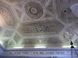 Los muros están divididas por semicolumnas en estuco brillante marmoleado, coronados por capiteles corintios que sostienen el entablamento perimetral, adornados con inscripciones en hebreo del Libro de los Reyes y del Libro de los Salmos.[2] La bóveda de claustro está decorada con frescos en claroscuro, representando motivos florales, objetos rituales e instrumentos musicales tradicionales.[7]