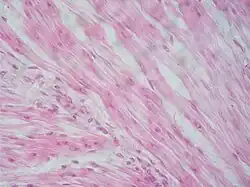 Al igual que el músculo esquelético, el músculo cardíaco también es un músculo con estriaciones debido a la presencia de retículo sarcoplásmico y miofibrillas. Inicialmente los investigadores consideraban que la fibra muscular cardíaca era un sincitio como la fibra esquelética. Sin embargo, con el desarrollo de la microscopía electrónica pudo comprobarse que no es un auténtico sincitio anatómico,[32] porque cada fibra miocárdica se encuentra separada de las vecinas por sus respectivos sarcolemas en la zona lateral, que se continúan con los discos intercalares en el extremo de cada fibra.[30]