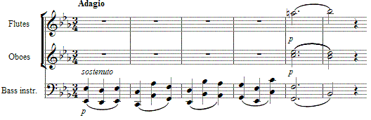 - ↑ a b Landon, H. C. Robbins (1955). The Symphonies of Joseph Haydn. Universal Edition. pp. 774-775. «2 fl., 2 ob., 2 clar., 2 fag., 2 cor., 2 clarini, timp., str.»