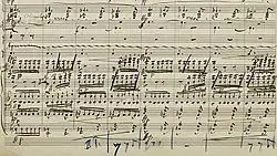 - ↑ De acuerdo con la lista de la instrumentación en la edición de la partitura editada por Dover, ambos clarinetes en Mi bemol deberían ser doblados en los pasajes en fortissimo, aunque no hay ninguna indicación al respecto en ningún lugar de la propia partitura.
