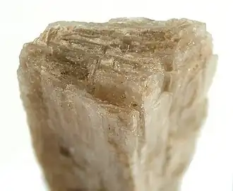 | Hábito cristalino | En costras cristalinas o agregados lamelares; cristales tabulares o prismáticos estriados verticalmente | |