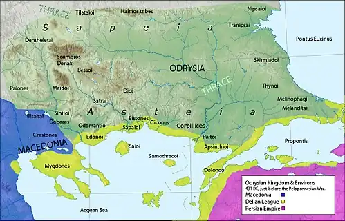 - ↑ D. C. Samsaris (1976). «Historical Geography of Eastern Macedonia during the Antiquity» (en griego). Tesalónica: Society for Macedonian Studies. p. 56–57. ISBN 960-7265-16-5. Archivado desde el original el 24 de abril de 2017..