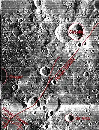 ![]() Imagen de la misión Lunar Orbiter 4, con Sirsalis al centro derecha, Sirsalis A al centro izquierda, y Sirsalis F y J abajo a la derecha. | ||