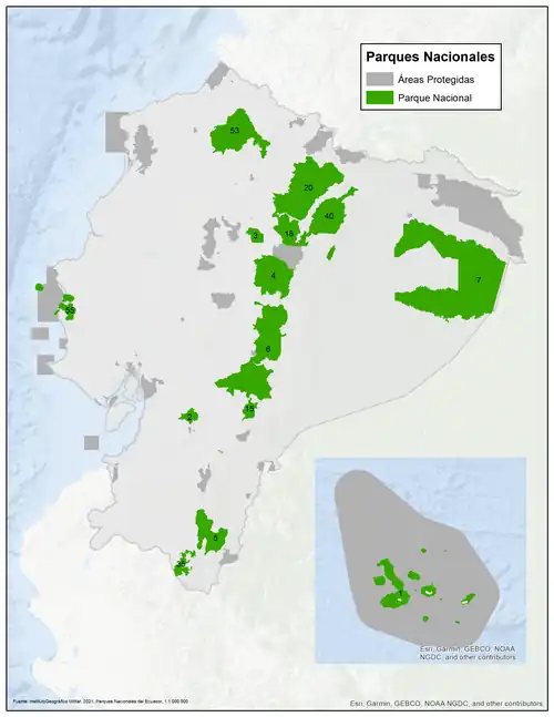 En 2023, el territorio de Ecuador se encuentra conservado el 20.60% en áreas protegidas terrestres (territorio continental, islas continentales, terrestre Galápagos) y en un 19,15% el marino que incluye el marino continental y el marino Galápagos).[1] La biodiversidad del país es protegida y conservada mediante el SNAP establecido en la Constitución de la República del Ecuador de 1998 (Art. 86) y ratificado en la Constitución 2008 (Art. 405).[3] El Sistema Nacional de Áreas Protegidas del Ecuador (SNAP) surge como una estrategia a nivel nacional in situ de conservación para la biodiversidad, esta abarca las cuatro regiones geográficas del país.[4]