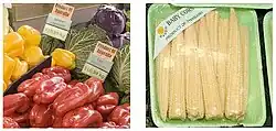 Orgánico (EE. UU.): La etiqueta Orgánica del USDA indica que el producto se ha elaborado de acuerdo con el Estándar Orgánico Federal del USDA. Esta etiqueta se aplica a frutas, verduras, carnes, huevos y productos lácteos. Algunos estados, como California, tienen su propia etiqueta orgánica. El etiquetado orgánico también es prominente a nivel internacional.