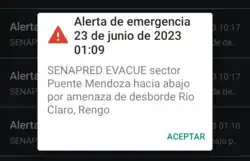 - ↑ a b Oporto, Sandar Estrella (21 de agosto de 2023). «Qué es el SAE de Senapred: así funciona el Sistema de Alerta de Emergencia». La Tercera. Consultado el 4 de febrero de 2024.