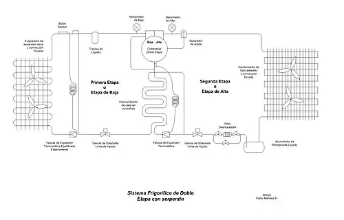 El sistema frigorífico de doble etapa consiste en forzar la circulación del gas refrigerante por dos etapas, denominadas de alta y baja presión por el interior de un compresor especial denominado compresor de doble etapa. Este artificio es necesario a fin de alcanzar menores temperaturas de evaporación con un solo compresor sin aumentar su relación de compresión.