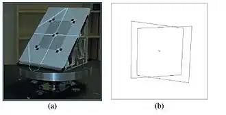 El difusor holográfico anisotrópico y el espejo están montados en un panel de fibra de carbono y conectado a un volante de inercia de aluminio de 45 grados. El volante gira en sincronía con respecto a las imágenes mostradas por el proyector.