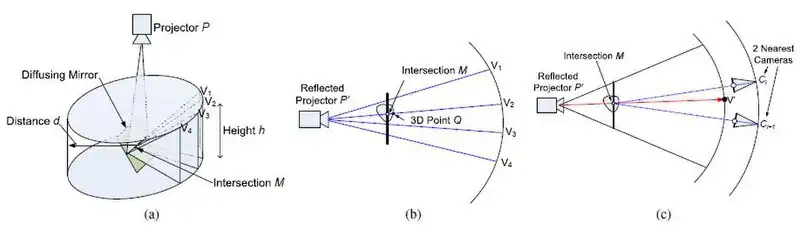 Suponemos que el espejo giratorio se centra en el origen y que su eje de rotación es el eje Y vertical, con el proyector de vídeo en el punto P por encima del espejo como en la figura superior. Suponemos, además, que el punto de vista que queremos obtener esta a una altura h y a una distancia d del eje Y. Por la simetría de rotación de nuestro sistema, podemos producir imágenes de perspectiva correcta para cualquier posición de visualización en el círculo definido por h, V y D, creando imágenes binoculares ya que H y D serán similares para ambos ojos. En la práctica, el conjunto de puntos de vista de la perspectiva que delimita V no tiene por qué ser un círculo continuo, sino que pueden pasar a través de una variedad de posiciones de seguimiento a diferentes distancias y alturas.