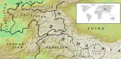 La cordillera del Pamir es un sistema montañoso situado entre los límites de Asia Central y meridional, siendo una proyección noroeste del sistema de los Himalayas. Forma una unión orográfica con las cordilleras Tian Shan, Karakórum, Kunlun y el Hindú Kush. Por ser un punto de reunión de varias cordilleras es también conocido como «Nudo del Pamir» y, junto al Tíbet, era conocida en tiempos victorianos como el Techo del Mundo.[5][6] Es conocida también por su nombre en chino, Congling.[7] La región del Pamir tiene su núcleo central en Tayikistán, específicamente en la región del Alto Badajshán. Parte de la cordillera del Pamir se sitúa también en los países de Kirguistán, Afganistán y Pakistán. Al sur de Alto Badajshán, el corredor de Wakhan atraviesa la región Pamir, la cual también incluye la parte norte de Afganistán y Pakistán.