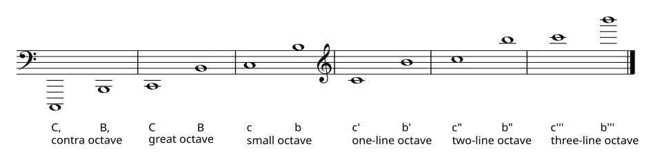 Este diagrama muestra ejemplos de la nota más grave y más aguda de cada octava, dando su nombre en el sistema de Helmholtz (con letras y primas), y en el método alemán de nomenclatura de octavas. (La octava por debajo de la contraoctava se conoce como sub-contra octave, ‘subcontraoctava’).