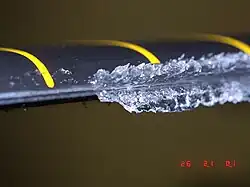 - Sistemas de alerta, o sistemas secundarios de detección de hielo Avisan a la tripulación de la existencia de condiciones de formación de hielo, para que estos actúen según sea necesario. El detector de hielo consta de una sonda situada físicamente en la parte lateral del fuselaje. Esta zona está protegida de cualquier perturbación importante del flujo y de la propia capa límite que aparece en el fuselaje. De esta forma, las condiciones de impacto del aire en el sensor son representativas de las condiciones de la corriente no perturbada.