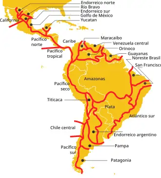 La diferenciación latitudinal de las ecorregiones toma en cuenta la progresiva mayor aridez de norte a sur, reconociendo: