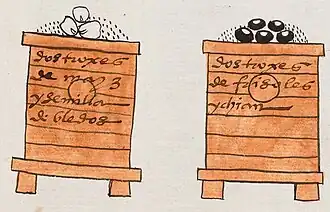 | Cuexcomatl | Troje o granero | Medida para granos, mazorcas, sal, chiles, etc (2000 - 6000 fanegas).[33] Utilizada ampliamente como medida tributaria y simbolizada con unidades de transporte en cajas de madera, las cuales eran más pequeñas para poder ser transportadas | 110 m³ - 330 m³ |