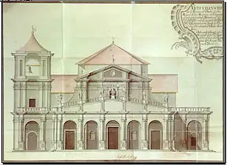 - "La iglesia es muy grande, toda en piedra grês, con tres naves en forma de media naranja, muy bien pintada y dorada, con un magnífico pórtico y de bellísima arquitectura; las bóvedas en forma de media naranja son de madera, el altar mayor es de ranuras sin que se doren, a falta de la última parte: en el crucero hay tres altares esculpidos, dos en estilo italiano, también de oro".