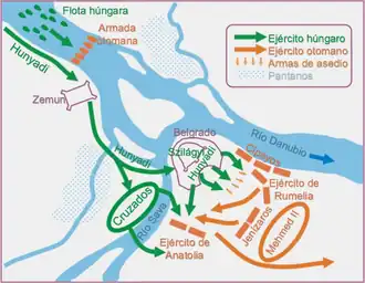 - ↑ a b The Papacy and the Levant, Kenneth M. Setton, pp. 177, 1984. El ejército cristiano se componía de cuatro mil soldados bien armados y entrenados con sesenta mil campesinos y ciudadanos de Belgrado reclutados para la defensa de la ciudad.