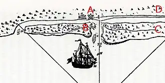 ![]() Detalla de un mapa de 1733 que muestra la costa de América del Norte entre Charles Town y San Agustín | ||||