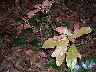 Las hojas son alternadas con los márgenes ondulados, dentadas y obovadas, de 7 a 30 cm de largo, con la punta un poco redondeada. Los tallos de las hojas miden de 6 a 25 mm de largo, con un recodo en la juntura de la cuchilla de la hoja. La nervadura es prominente en ambos lados de la hoja.
