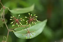 Es una enredadera leñosa, con el tallo ramificado, subcilíndrico, que alcanza un tamaño de 10 m de longitud. Con pecíolo de 1 a 2 cm, estrechamente alados para 2/5-1/2 de su longitud, los zarcillos comúnmente presentes. Las hojas ampliamente elípticas a ovado-elípticas. La inflorescencia en forma de racimo de 3 - 6 (- 10) umbelas, de 3 - 7 cm, umbelas con los dos sexos con 12 - 25 flores. Las flores masculinas: de color verde oliva y tépalos rojos. Las flores femeninas: los pétalos más pequeños que los masculinos. Los frutos son bayas globosas, de 5 - 7 mm de diámetro.[1]