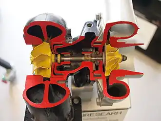 Turbocompresor seccionado. A la izquierda turbina con su estátor en rojo y rotor en amarillo; a la derecha compresor con iguales colores