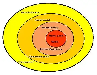 En el diagrama puede observarse cómo los distintos sistemas normativos se agrupan unos dentro de otros. Esto se hace para reflejar cómo, por ejemplo, no todas las normas sociales están en el código penal, pero todas las normas del código penal son normas sociales. En realidad este modelo es una simplificación de cómo se interrelacionan los sistemas normativos, ya que existen multitud de excepciones: es habitual que alguna de las normas sociales existentes no sea aceptada por la moral individual de algunas personas, lo que da lugar a la aparición de las subculturas; también sucede a menudo que algunas normas del sistema jurídico o penal no lleguen a integrarse dentro de las normas sociales. Esto sucede, sobre todo, en los sistemas no democráticos, aunque también ocurre en las democracias. Un ejemplo actual es la contradicción de muchas legislaciones con la aceptación social de las descargas por internet. Cuando existen fuertes contradicciones entre los sistemas normativos puede producirse una crisis que los modifique. Por este motivo, autores como Durkheim consideran la desviación como un motor del cambio social.[4]