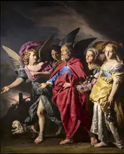 Cuando los habitantes de Sodoma descubrieron que Lot había recibido a dos forasteros ―los ángeles―, fueron hasta su casa para violarlos.[5][6] Lot intentó persuadirles diciendo: «Por favor, hermanos, no hagáis esta maldad. Mirad, aquí tengo dos hijas que aún no han conocido varón. Os las sacaré y haced con ellas como bien os parezca; pero a estos hombres no les hagáis nada, que para eso han venido al amparo de mi techo».[7] Cegando a los hombres que estaban junto a la puerta de la casa de Lot, por querer abusar de los ángeles enviados por Dios, los ángeles sacan al patriarca y a su familia de la ciudad y les dan la orden de seguir siempre en dirección a las montañas sin mirar para atrás. La esposa de Lot, sin embargo, desobedeció la orden dada, miró hacia atrás y fue transformada en estatua de sal. Entonces, en consonancia con el Génesis, se inicia la destrucción de Sodoma y de toda la llanura de aquella región.