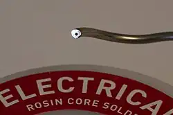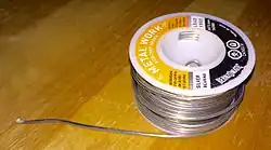 Para trabajos eléctricos y electrónicos, el alambre de soldadura está disponible en una gama de grosores para soldadura manual (la soldadura manual se realiza con un soldador o una pistola de soldar), y con núcleos que contienen fundente. También está disponible en forma de pasta a temperatura ambiente, como lámina preformada adaptada a la pieza de trabajo, que puede ser más adecuada para la producción en serie mecanizada, o en pequeñas "lengüetas" que pueden envolverse alrededor de la unión y fundirse con una llama cuando no se puede utilizar o no se dispone de un soldador, como por ejemplo en las reparaciones sobre el terreno. Las aleaciones de plomo y estaño se utilizaban habitualmente en el pasado y aún están disponibles; son especialmente prácticas para soldar a mano. El uso de soldaduras sin plomo ha ido en aumento debido a los requisitos normativos y a las ventajas para la salud y el medio ambiente de evitar los componentes electrónicos con plomo. Hoy en día se utilizan casi exclusivamente en electrónica de consumo.[2]