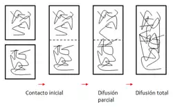 El proceso se puede observar de manera más intuitiva en la figura adjunta, donde se indican el contacto íntimo inicial, seguido de una difusión parcial de las cadena poliméricas y por último la difusión completa en la que ya no hay entrecara entre ambos sustratos. Ha de tenerse en cuenta que los tiempos característicos de esta etapa difieren de unos materiales a otros en función de la temperatura a la que se alcance la viscosidad adecuada.