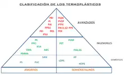Si bien los polímeros termoplásticos básicos son ampliamente conocidos, no lo son tanto los avanzados. Por este motivo se realiza la siguiente clasificación de los plásticos más representativos de la familia distinguiendo entre amorfos y semicristalinos y, dentro de estas dos subcategorías, domésticos, ingenieriles y avanzados. Asimismo, mediante la tabla adjunta, se muestran características de algunos los termoplásticos avanzados más representativos y de uno de uso común, como es el PVC, para hacerse una idea de las mejoras obtenidas.