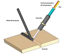 La soldadura mediante gas caliente no es más que la soldadura oxiacetilénica de los metales extrapolada a los termoplásticos. El calentamiento de los sustratos se realiza, en lugar de con la llama que se empleaba en aquellos, mediante un chorro de gas a temperatura elevada. Este gas calienta a su vez la varilla de material de aporte, material que debe ser de la misma naturaleza que los sustratos a unir y que se va depositando en la unión una vez que aquí se alcanza la temperatura adecuada.