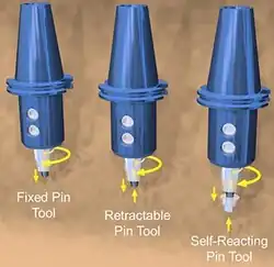 Se tendrá que diferenciar dos partes: el perno y la herramienta que sujeta a éste. Ambos elementos son clave a la hora de determinar la calidad de la unión ya que se ven afectados por diferentes tipos de fuerzas (fuerza estática, fuerza de fatiga), por la resistencia ala corrosión, y nos permiten calcular las fuerzas y velocidades necesarias para controlar el flujo del metal.[cita requerida] Existe un amplio abanico de geometrías disponibles, pero las más usadas son las herramientas con perno fijo, que no se mueve respecto a la sujeción (la primera figura de la imagen), y las herramientas con perno retráctil (segunda y tercera figuras de la imagen), que sí que poseen dicho movimiento, acomodándose de esta forma a las posibles variaciones de espesor a lo largo de la unión. Además se podrá eliminar el agujero que queda cuando se retira la herramienta al final del proceso de soldadura.[cita requerida]