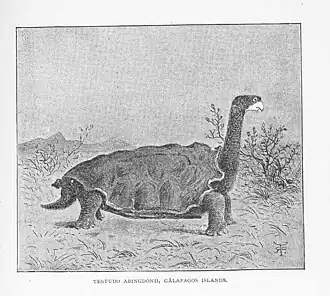 - ↑ a b Rodríguez-Guerra, Andrea (2019). Chelonoidis abingdonii. En: Torres-Carvajal, O., Pazmiño-Otamendi, G. y Salazar-Valenzuela, D. 2019. Reptiles del Ecuador. Versión 2019.0. Museo de Zoología, Pontificia Universidad Católica del Ecuador. Consultado el 31 de agosto de 2020.