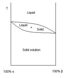 El diagrama de fases de la figura muestra una aleación de dos metales que forman una disolución sólida a todas las concentraciones relativas de las dos especies. En este caso, la fase pura de ambos es de idéntica estructura cristalina, y las propiedades similares de los dos elementos permite sustituciones parciales en toda la amplia gama de concentraciones relativas de los dos metales.